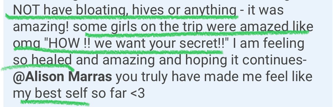 "Working with Alison has been one of my best decisions to date. I had been on proton pump inhibitors (PPI's aka heartburn meds) since I was in high school, maybe longer (I've lost track). Within weeks of working with Alison I was able to wean myself off of them. We healed my upper gut to the point where I have not needed any heartburn meds in the last 11 weeks. We changed what and when I eat certain foods to help aid this process. Its so good to know I don't need medicine to survive eating. Alison was super approachable with any and all questions I have come up with along this journey. I felt super supported through this whole process."